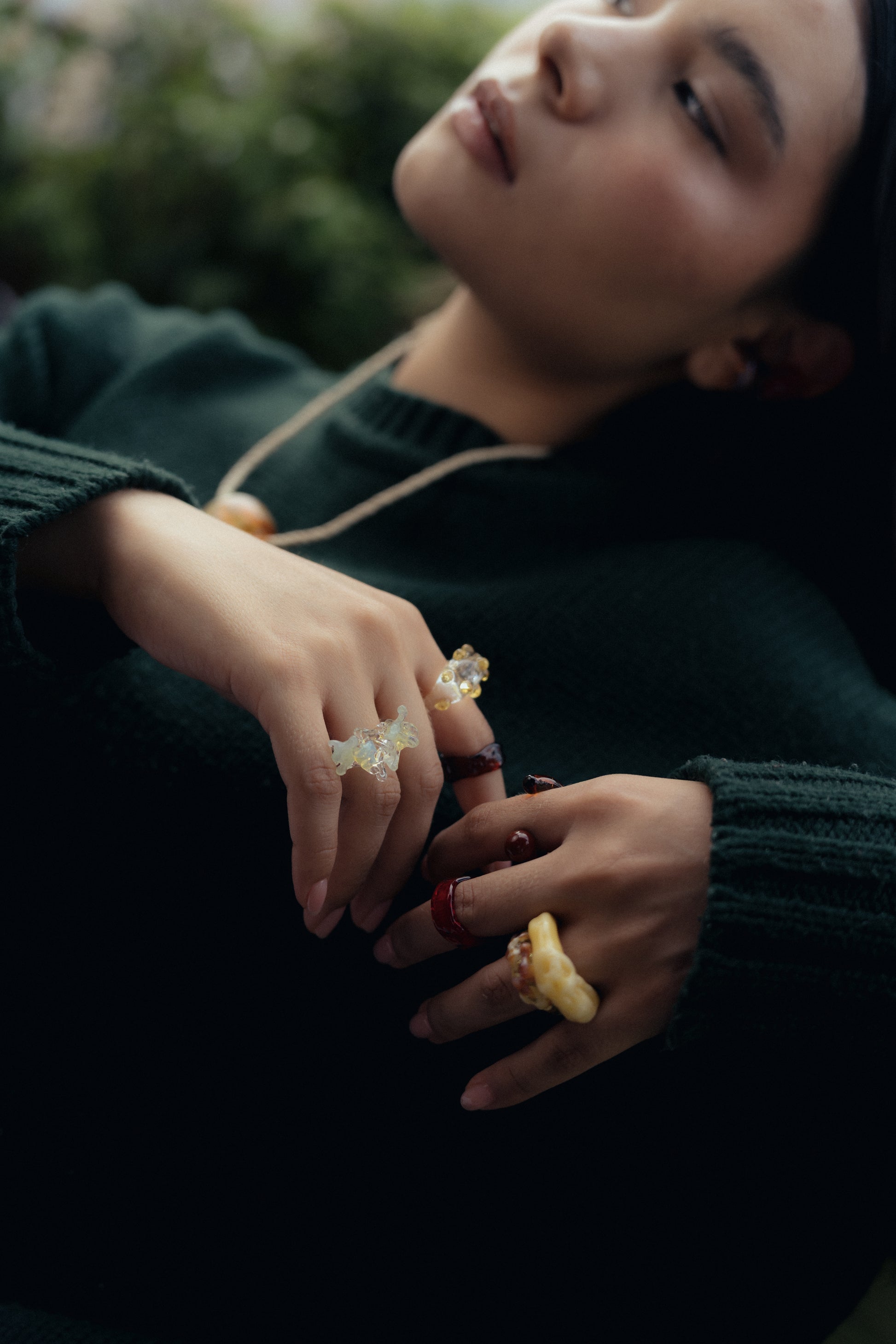 Anillo transparente con colores azul y amarillo con textura que simula ser agua