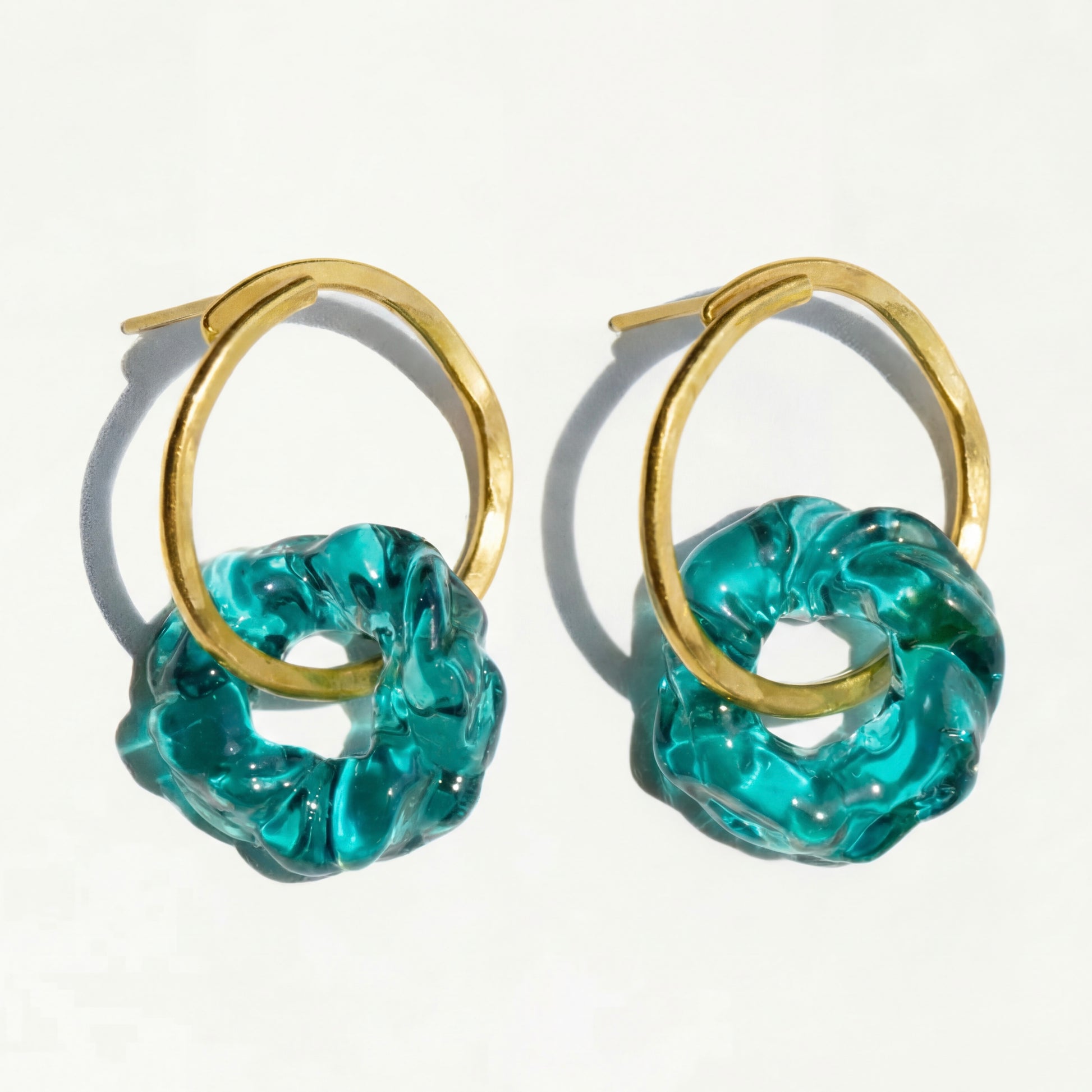 Aretes de bronce bañado en oro de 24k con dije de vidrio.