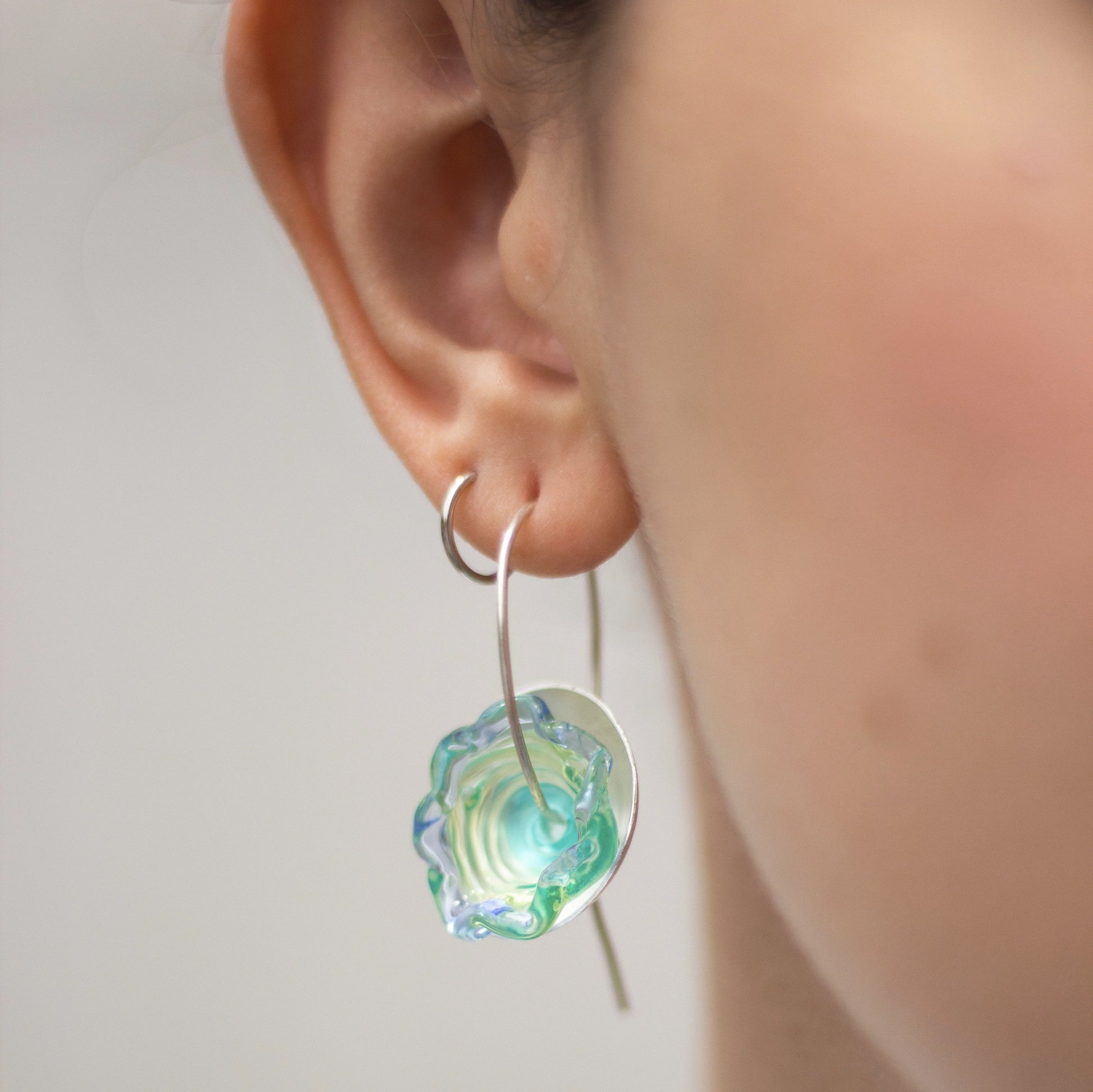 Aretes colgantes en plata con flor esculpida en vidrio.