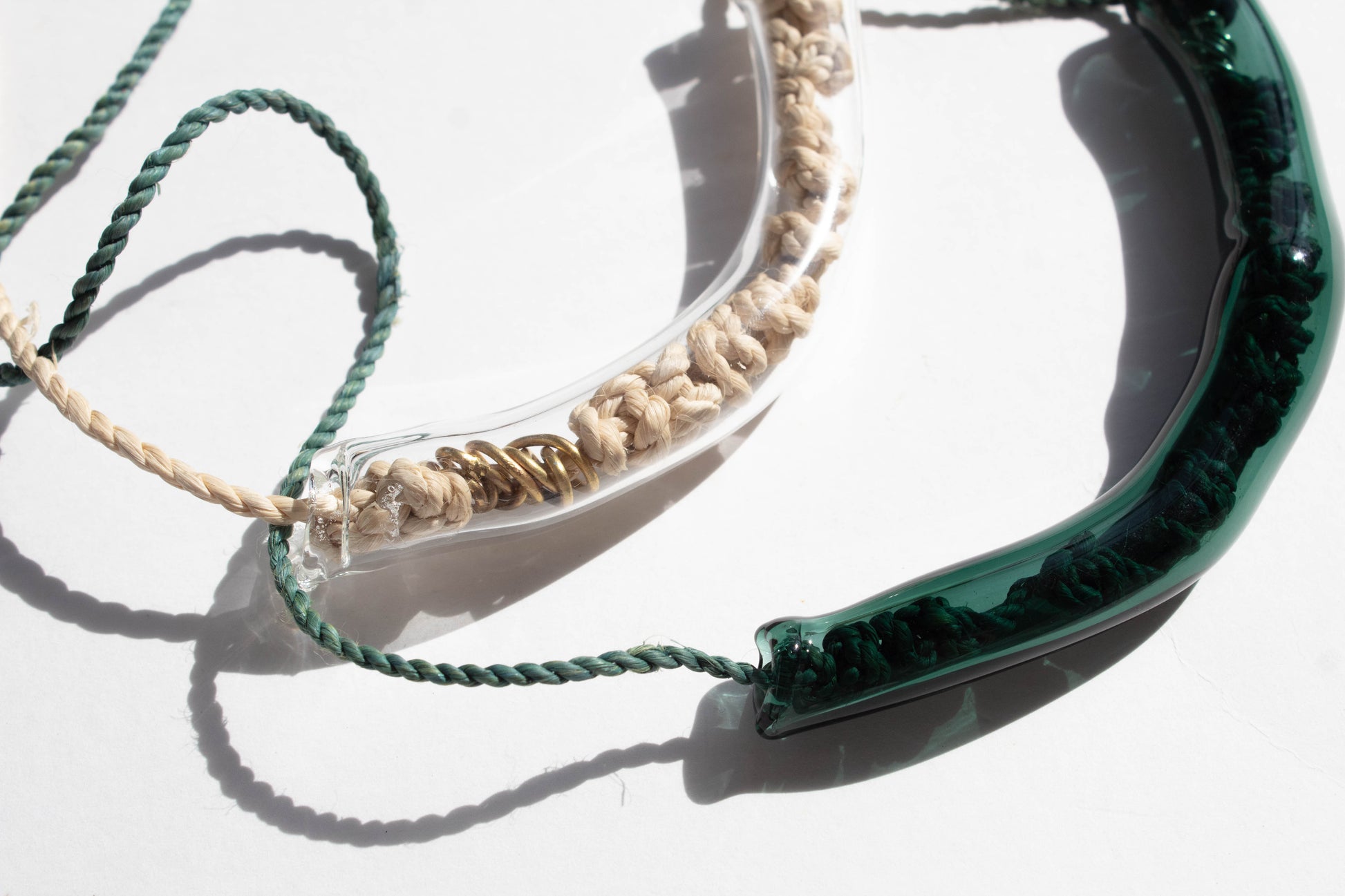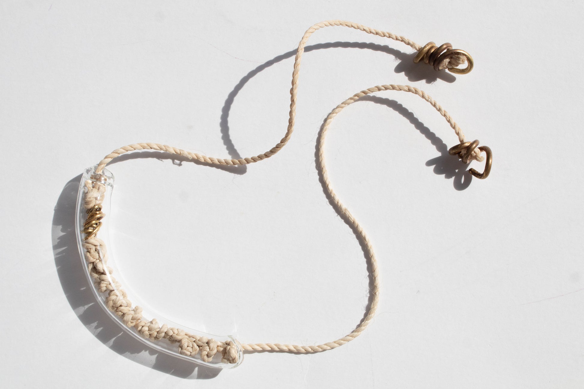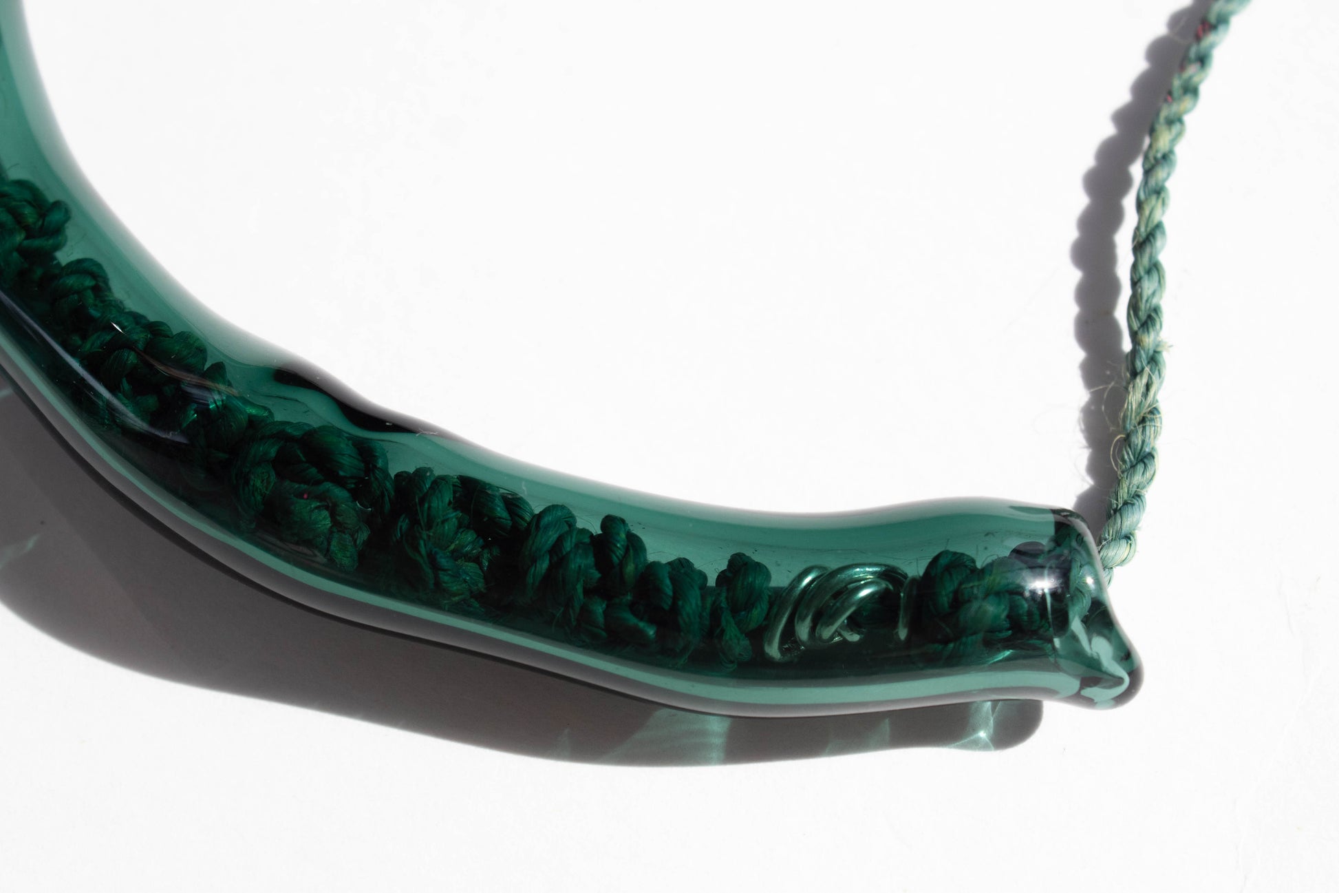 Collar en hilo de cumare con nudos y dije grande de borosilicato tubular.