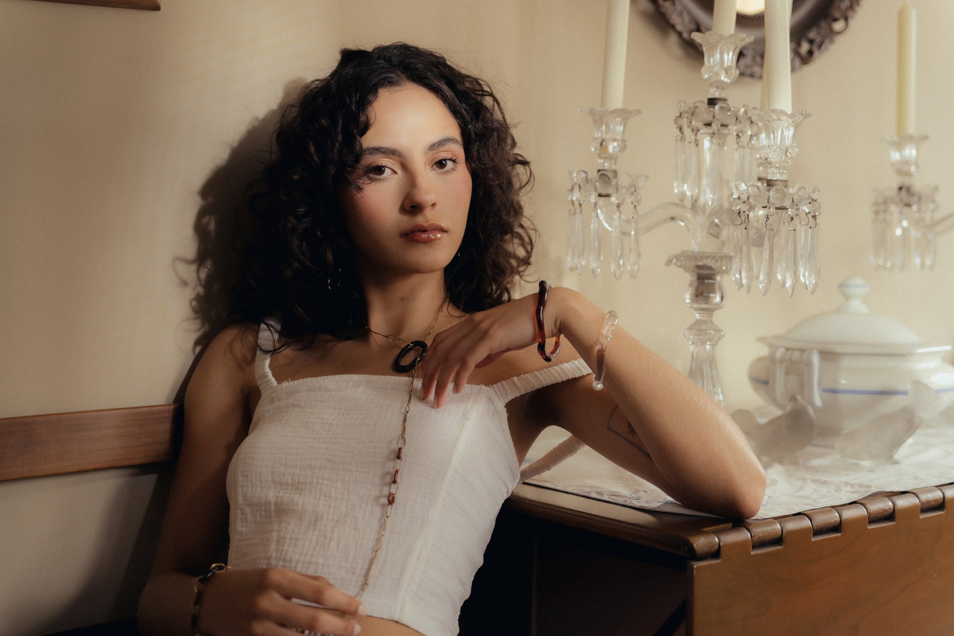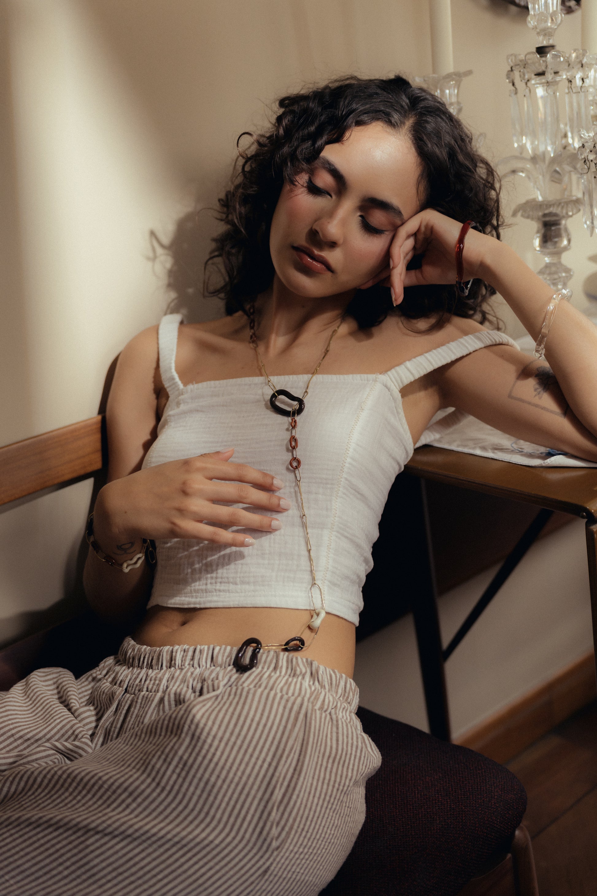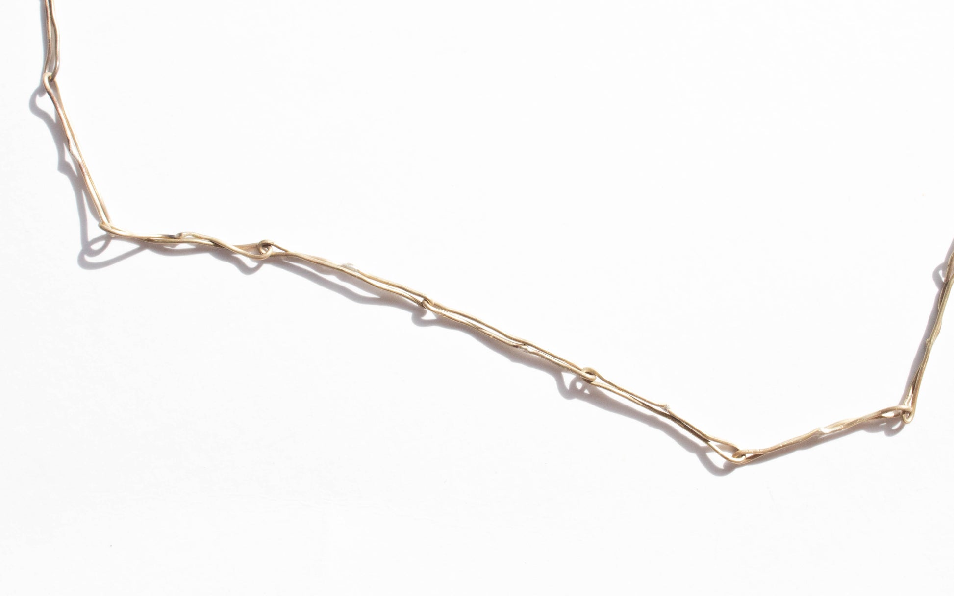 Collar con eslabones y uniones en bronce bañado en oro de 24k y vidrio esculpido a mano. Broche que permite graduar el largo del collar. Insertar un dije dentro de otro para generar un cierre que permite graduar el largo del collar.