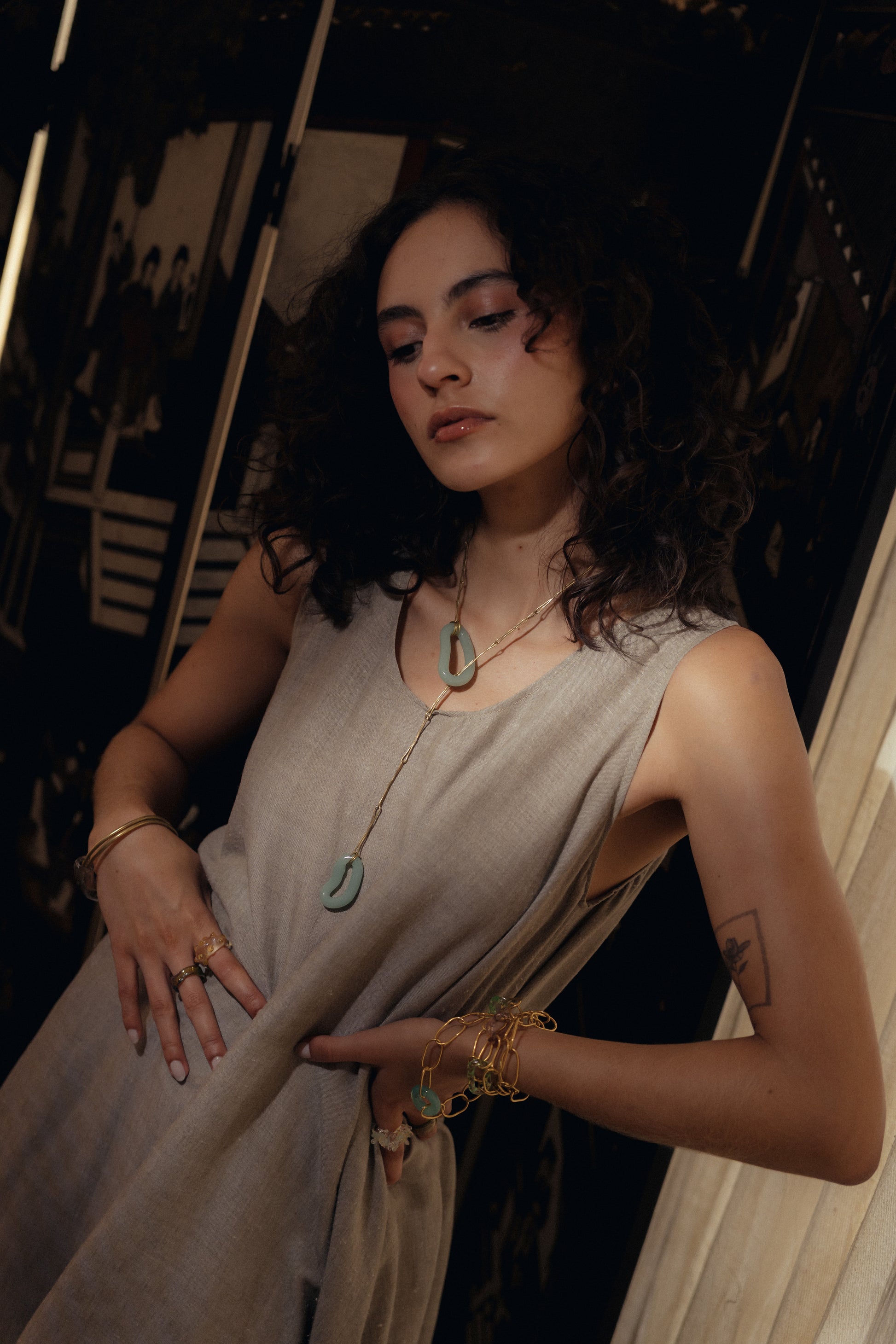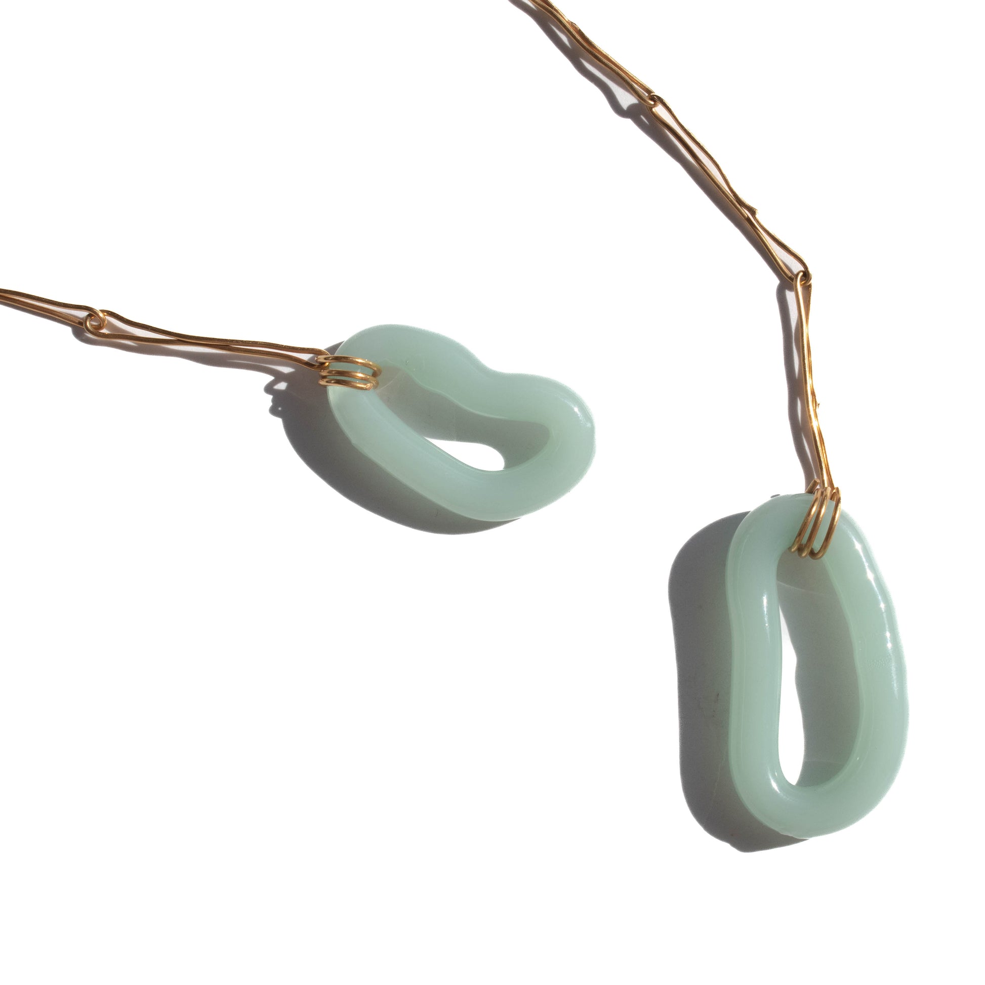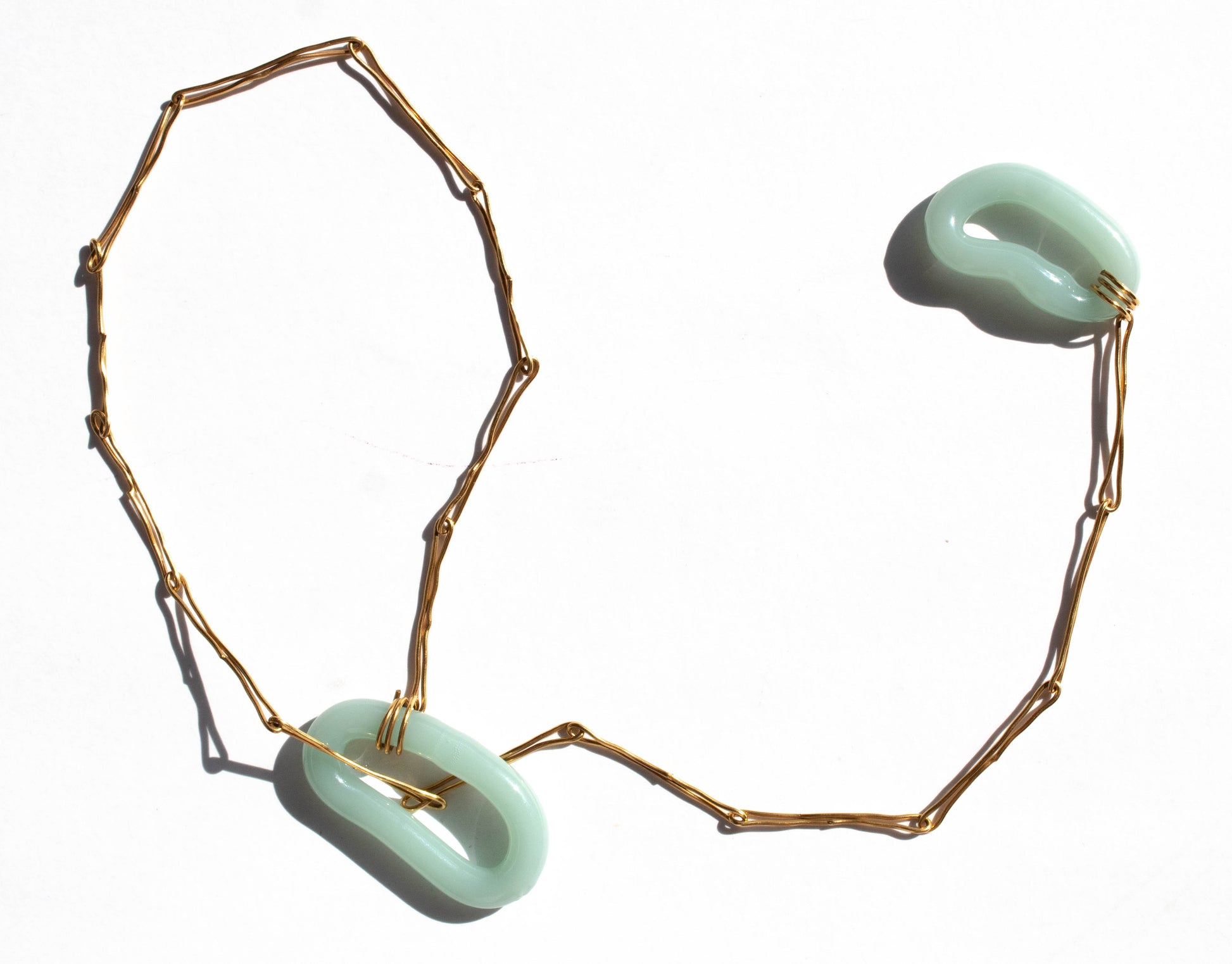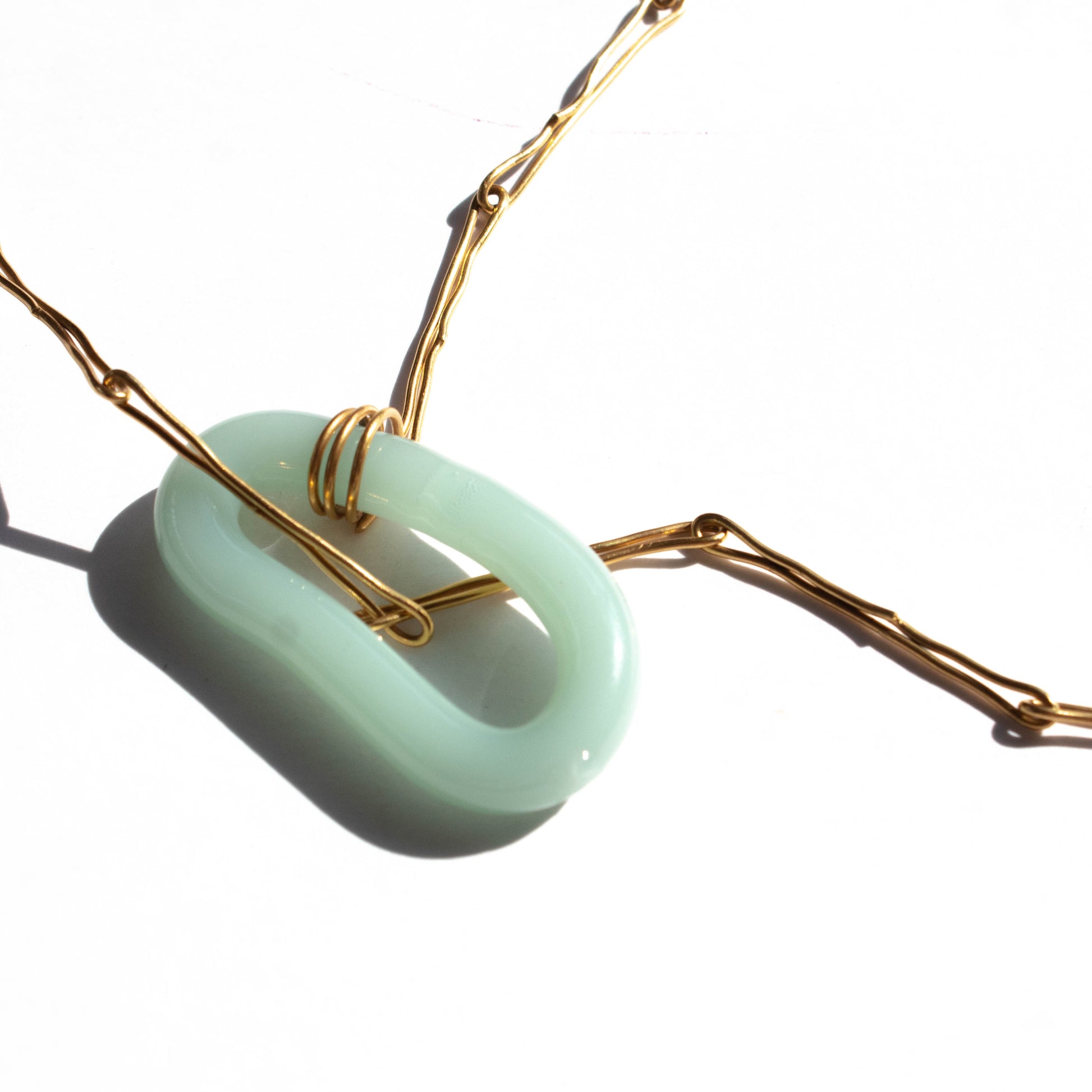 Collar con uniones en bronce bañado en oro de 24k y vidrio esculpido a mano. Insertar un dije dentro de otro para general un cierre que permite graduar el largo del collar.