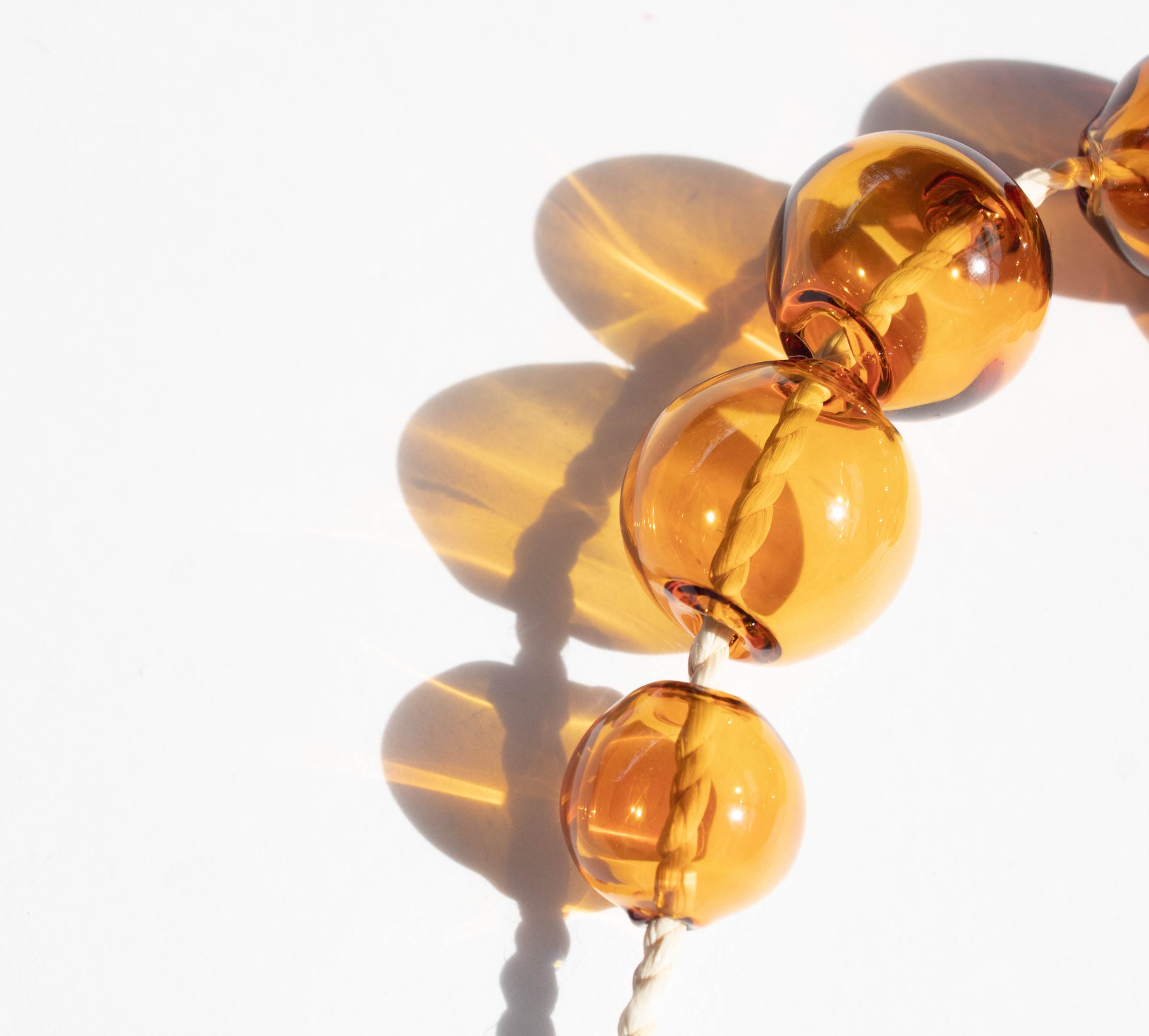 Collar graduable con hilo de cumare. Dijes de esferas de vidrio soplado color ámbar moldeado a mano.
